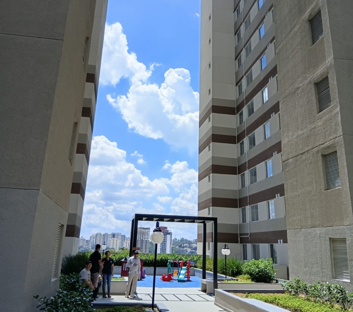 O empreendimento conta com 75 vagas cobertas de estacionamento de uso comum, 2 para PcDs, 1 destinada a veículo utilitário, 17 vagas para motos e 22 para bicicletas. As famílias poderão usufruir de área de lazer coberta, com salão de festas, salão de jogos, brinquedoteca, playground, espaços multiusos e espaço para ginástica. O projeto contemplou também áreas para os funcionários do residencial: copa, vestiários e sanitário. O condomínio tem ainda dois reservatórios: um para reaproveitamento das águas pluviais e outro para escoamento monitorado, que contribui no controle de inundações.
